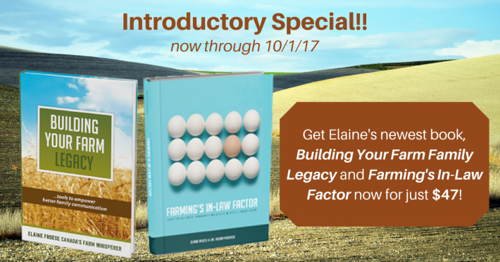 You can take the first step by heading over to our store and grabbing your copy of Building Your Farm Legacy. Now through October 1st, we are running an introductory special: Get hard copies of both Building Your Farm Legacy and Farming’s In-Law Factor for just $47 plus shipping (regularly $60).